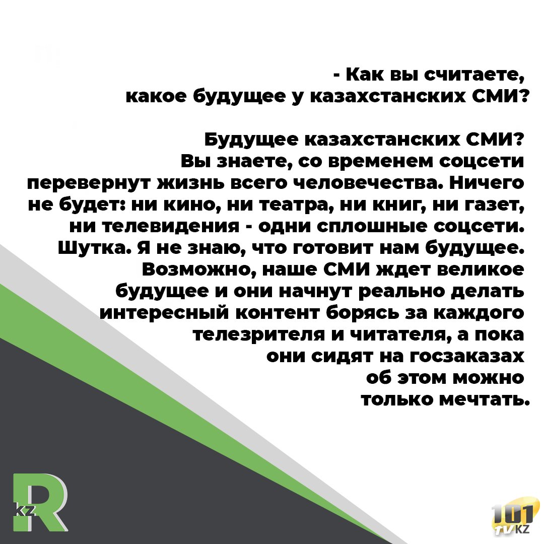 Будущее казахстанских СМИ? Вы знаете, со временем соцсети перевернут жизнь всего человечества. Ничего не будет: ни кино, ни театра, ни книг, ни газет, ни телевидения - одни сплошные соцсети. Шутка. Я не знаю, что готовит нам будущее. Возможно, наше СМИ ждет великое будущее и они начнут реально делать интересный контент борясь за каждого телезрителя и читателя, а пока они сидят на госзаказах об этом можно только мечтать.