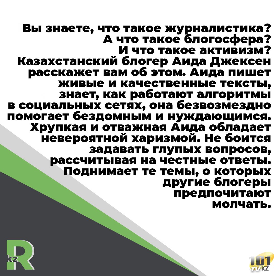 Вы знаете, что такое журналистика? А что такое блогосфера? И что такое активизм? Казахстанский блогер Аида Джексен расскажет вам об этом. Аида пишет живые и качественные тексты, знает, как работают алгоритмы в социальных сетях, она безвозмездно помогает бездомным и нуждающимся. Хрупкая и отважная Аида обладает невероятной харизмой. Не боится задавать глупых вопросом, рассчитывая на честные ответы. Поднимает те темы, о которых другие блогеры предпочитают молчать.